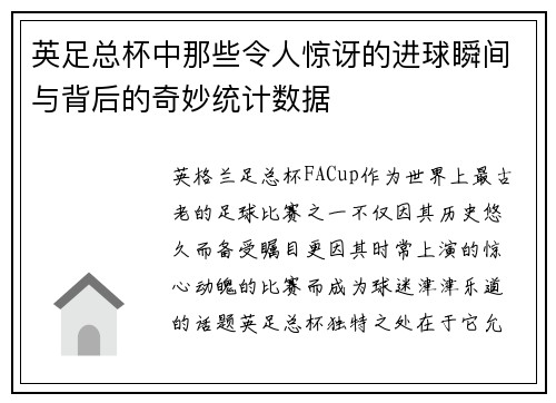 英格兰足总杯(FA Cup)作为世界上最古老的足球比赛之一,不仅因其历史悠久而备受瞩目,更因其时常上演的惊心动魄的比赛而成为球迷津津乐道的话题。英足总杯独特之处在于,它允许来自不同级别联赛的球队同场竞技,较弱队伍往往能够在强队面前创造意外的“冷门”,并且许多历史性的进球瞬间也由此产生。本文将从四个方面详细探讨英足总杯中的一些令人惊讶的进球瞬间,并通过背后的奇妙统计数据进一步解读这些进球的特殊性。这四个方面分别是:令人瞠目结舌的冷门进球、来自低级别球队的逆袭、进球背后的战术创新以及不可思议的最后时刻奇迹。通过这些讨论,我们将更加深入地了解英足总杯中的精彩瞬间与其背后的深刻意义。